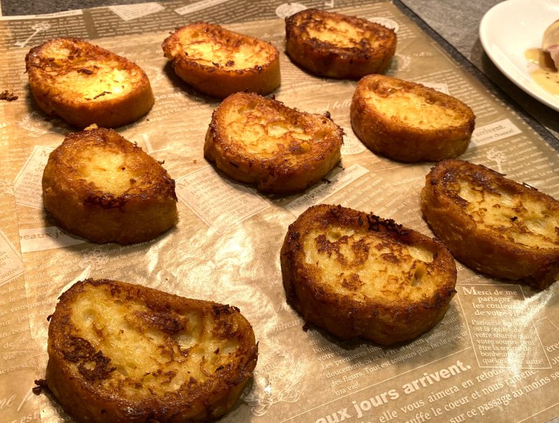 フランスパンを卵液にしっかりと浸し、シェフが目の前で香ばしく焼き上げます。