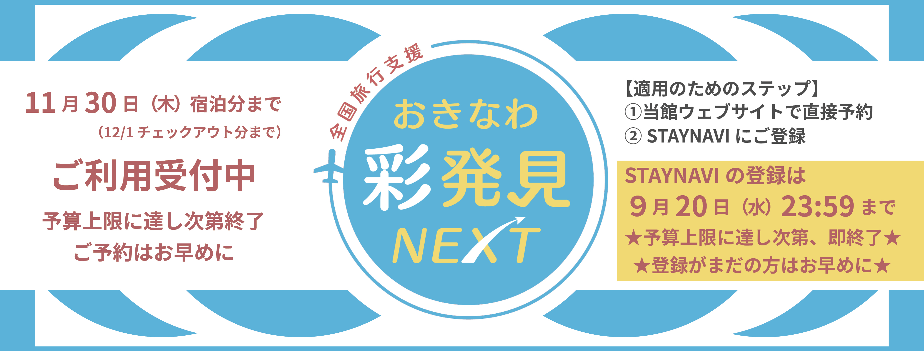 STAYNAVIクーポン新規取得は、2023年9月20日(水)23:59で停止予定。それ以前に予算に達した場合は即停止されますのでご注意ください。