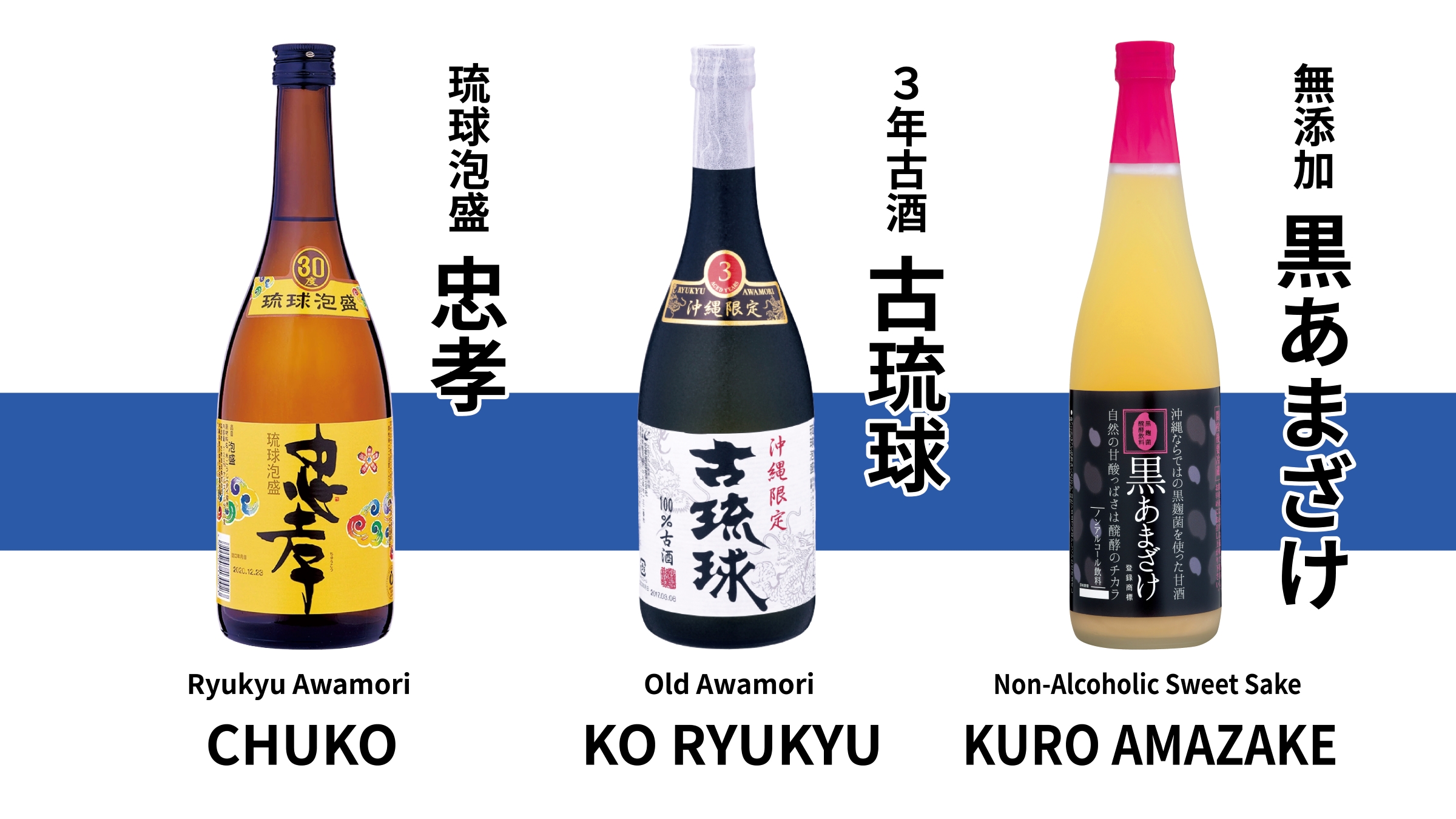 忠孝酒造の代表銘柄である琉球泡盛「忠孝」、3年古酒「古琉球」、そして沖縄ならではの黒麹菌を使った甘酒「黒あまざけ」(ノンアルコール)の3種を、お愉しみいただけます。